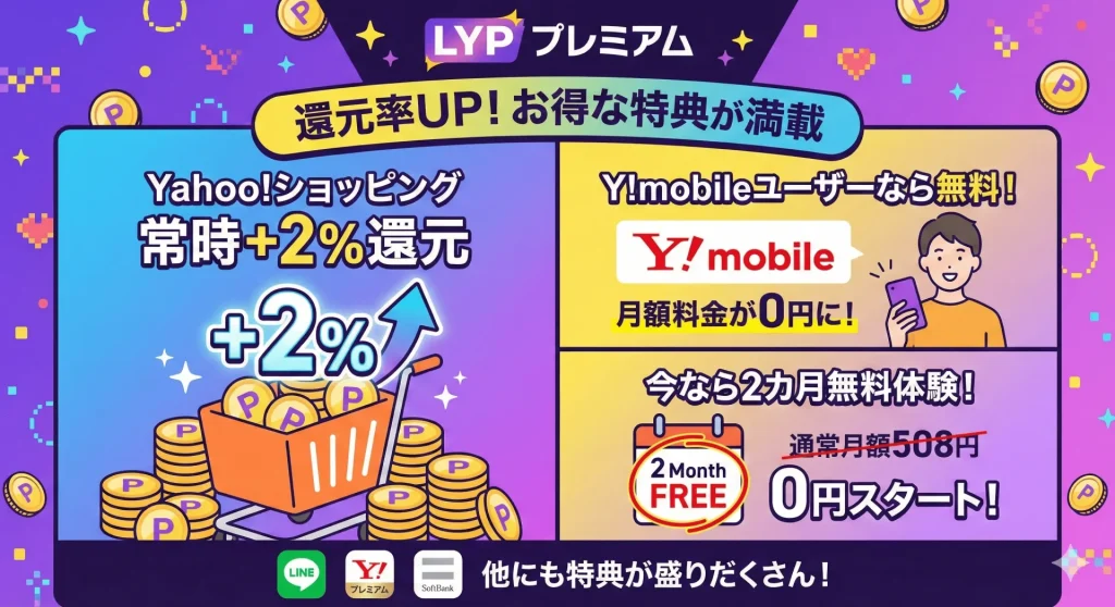 LYPプレミアム(月額508円)加入でポイント還元率+2%。2カ月無料期間があるので活用しましょう。