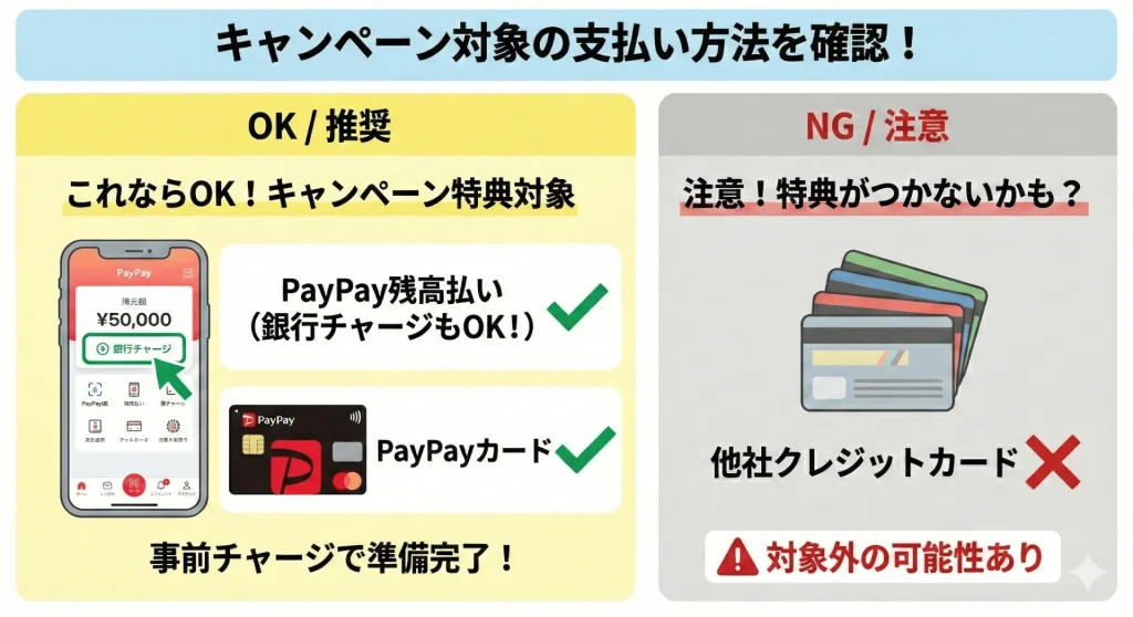 他社のクレジットカードで支払うと、キャンペーン特典が一切つかない場合があるため注意してください。