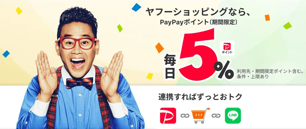 「毎日5%」などの主要キャンペーンの一つ。PayPayカードは年会費無料なので、Yahoo!ショッピングを頻繁に使うなら持っておくと便利です。
