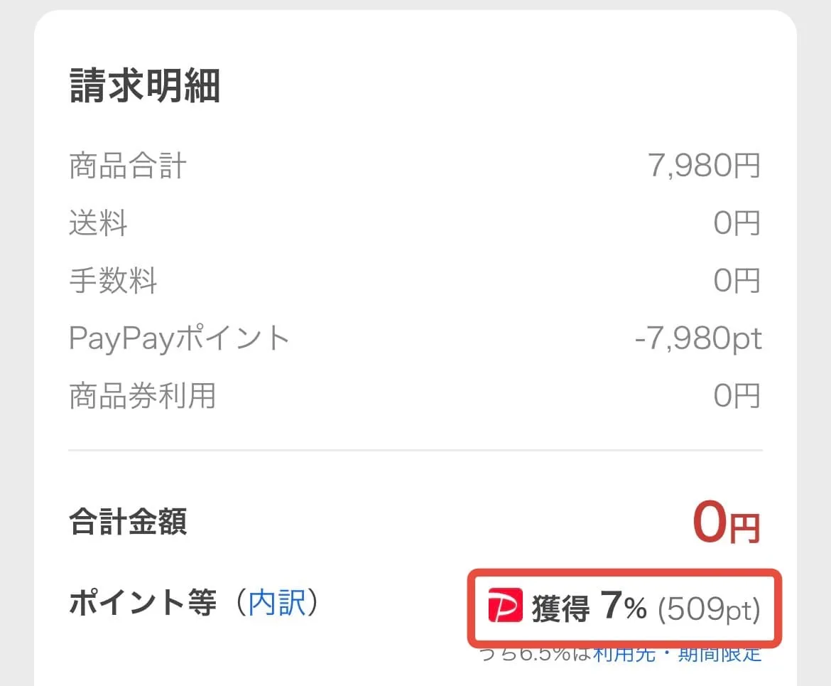 ※システム上、ポイント全額払いは「PayPay残高決済扱い」になるので、PayPayクレカ利用1%→PayPay残高払い0.5%になるので、0.5%だけ下がります。