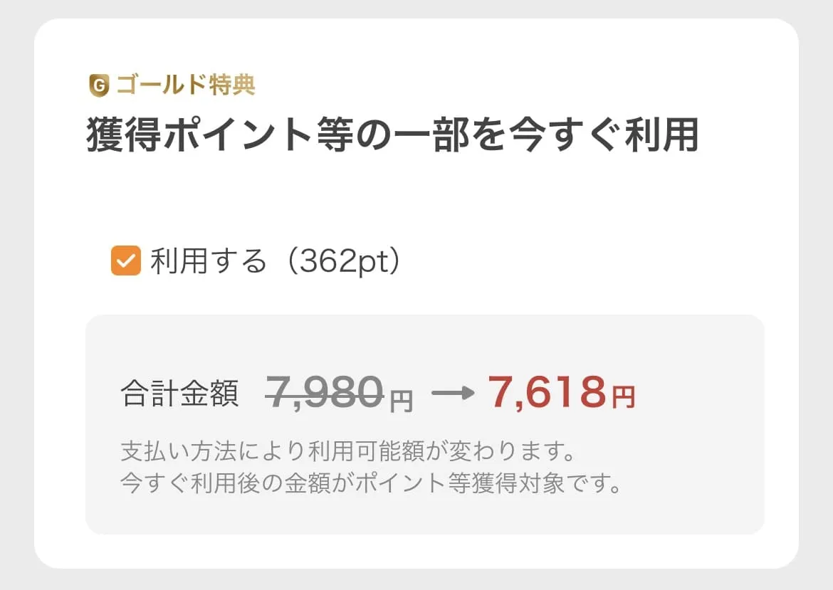 通常、ポイント還元といえば「後日ポイントが付与される」のが一般的ですが、この機能を使うと、獲得予定のポイントの一部を「その場の支払いに充当(値引き)」することができます。