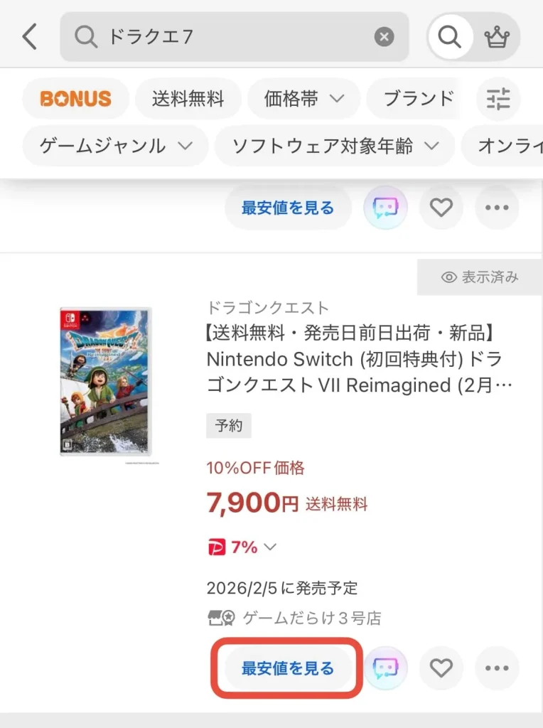 話題の新作「ドラゴンクエストVII Reimagined(定価8,778円)」を例に、大手3大通販サイトの価格を調査しました。