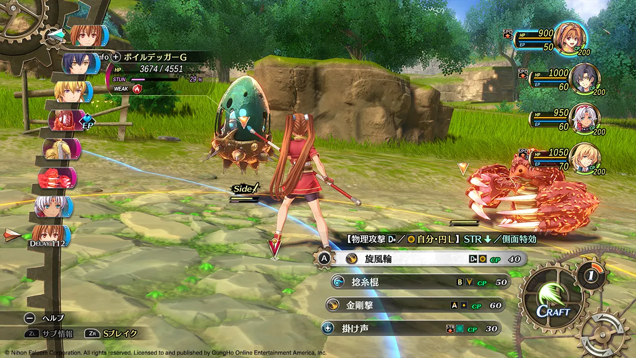 攻撃アクションは、隙の少ない「通常攻撃」だけでなく、キャラ固有の強力な「クラフト(戦技)」も使用可能。 これらを駆使して敵を「気絶(スタン)」させれば、敵が弱体化した有利な状態でコマンドバトルに突入できます。